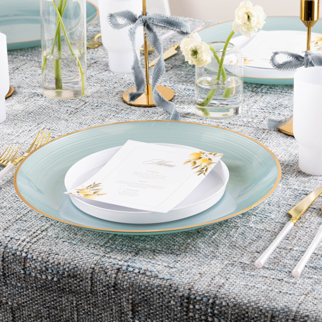 Our Crystal Chargers bring radiant sophistication to the table, featuring a sparkling, glass-like finish that enhances any place setting with luxurious depth and brilliance.