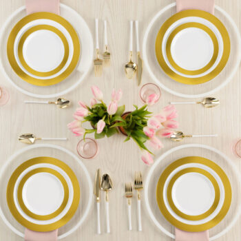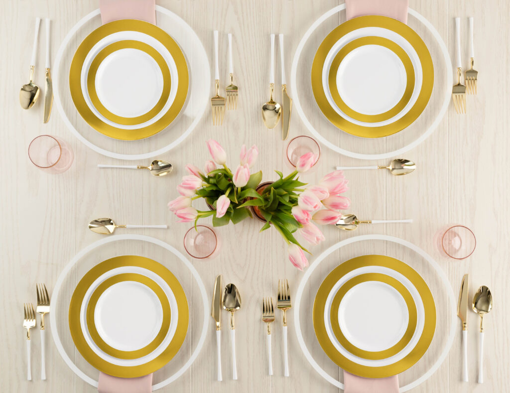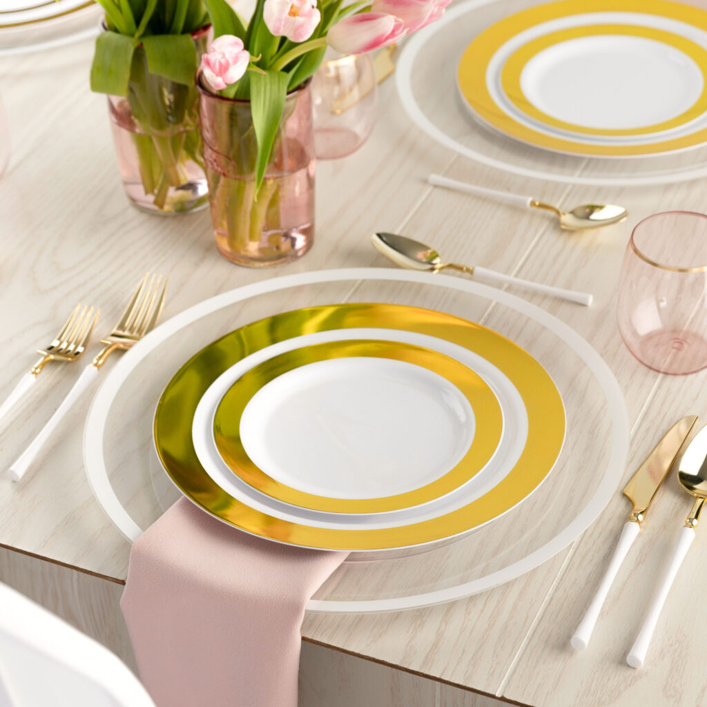 Give your event a special touch with Glitz Dinnerware. These awesome hard plastic plates add personality and vibe to parties, banquets and catered events.