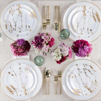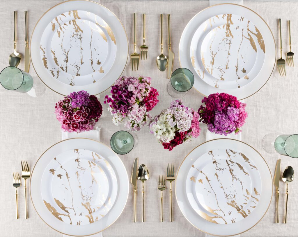 Made of durable plastic, this elegant set of plastic china has a beautiful gold stroke design across each plate. Perfect for fine dining.