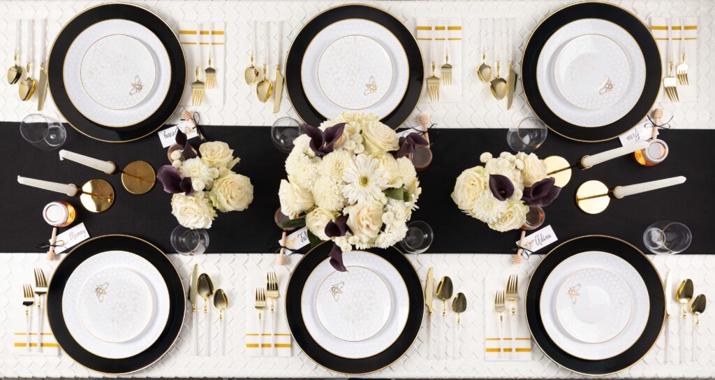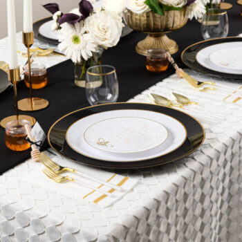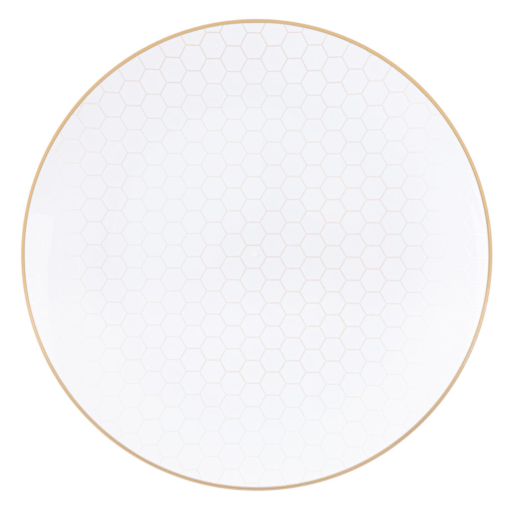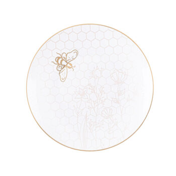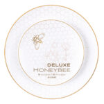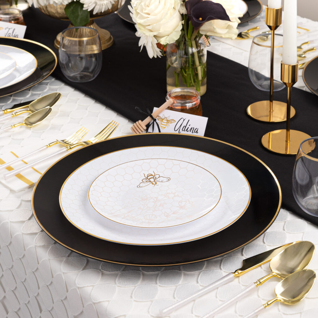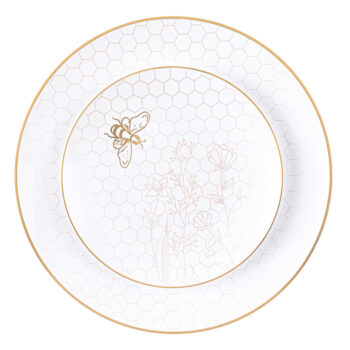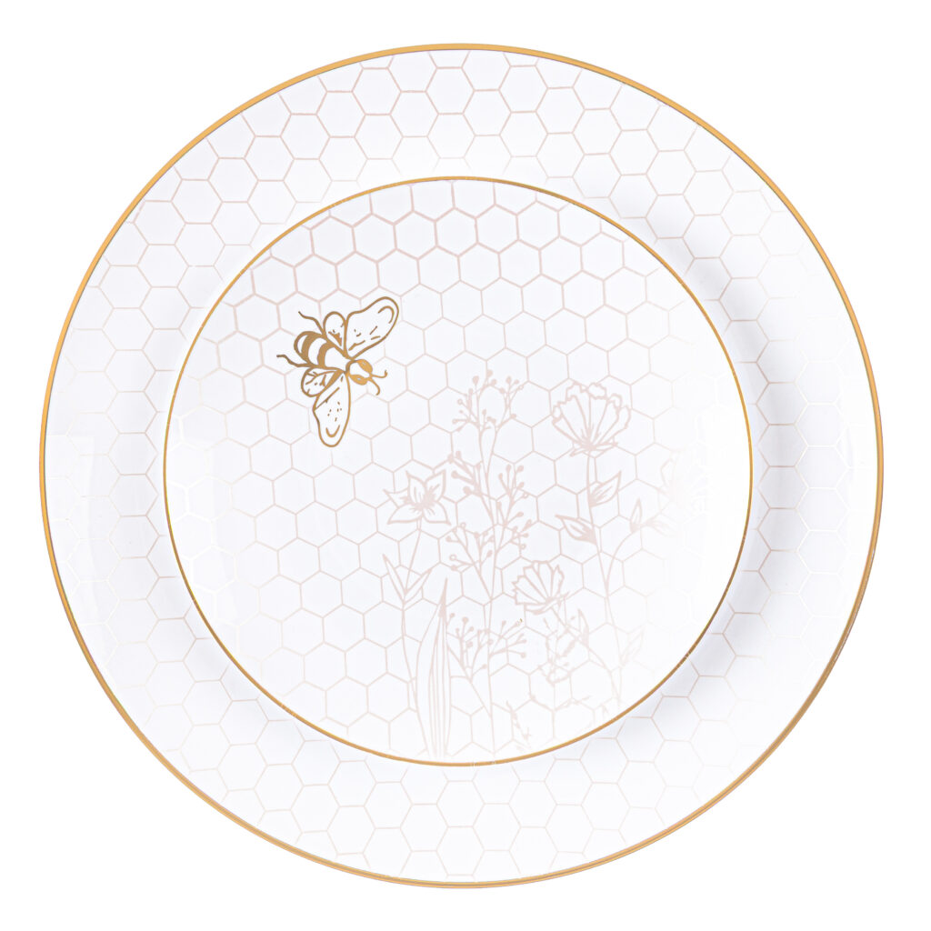 Our elegant white plates, adorned with an intricate gold honeycomb and a delicate honeybee, are a beautiful and meaningful way to celebrate a sweet new year. Their timeless design also makes them a versatile choice for any occasion beyond Rosh Hashana.
