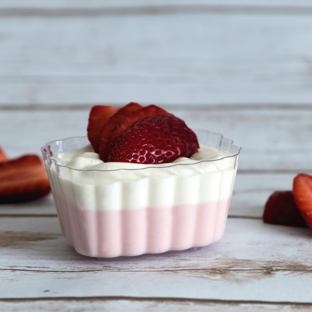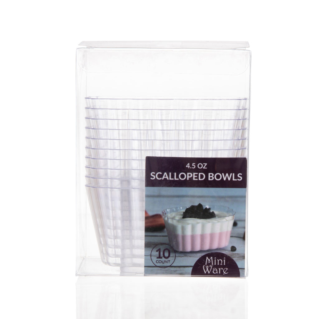 There’s so much personality in this little clear plastic oblong bowl. The charming scalloped walls make these mini bowls unique. Fill them with small portions of chocolate mousse or use them for salad dressings. Your guests will love them.