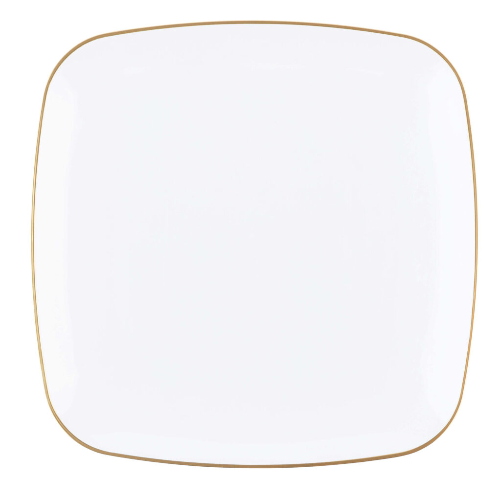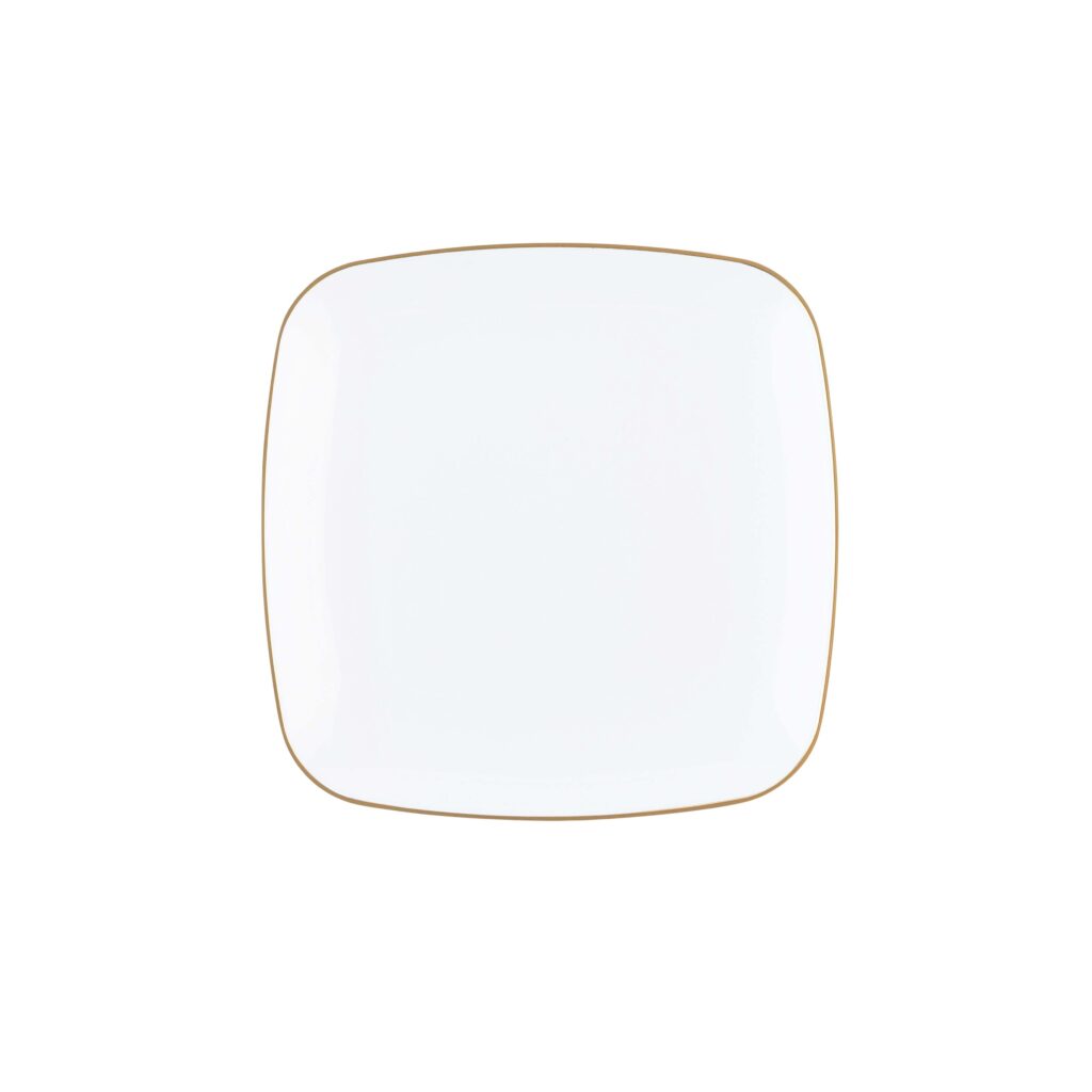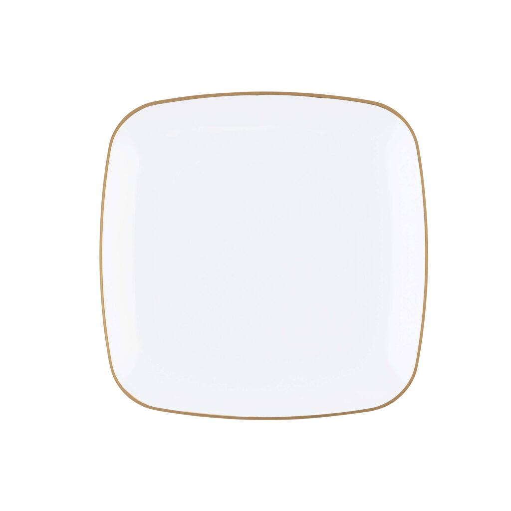 A timeless square design with white gold-rim on quality plastic plates. The plates are the perfect addition to any party! Your guests will not believe these china looking plates are disposable!