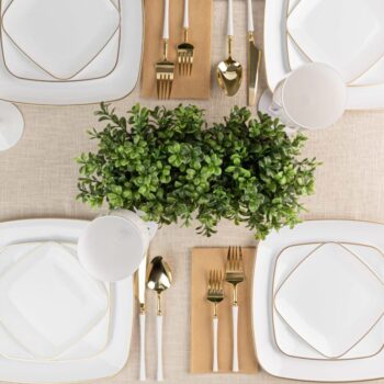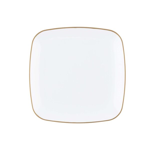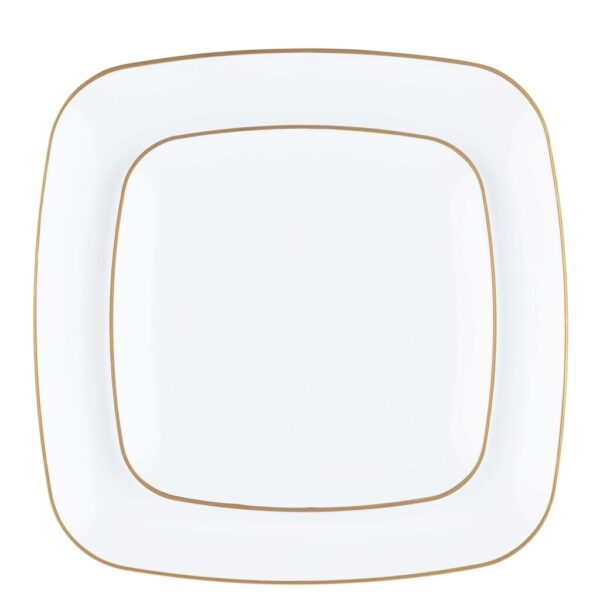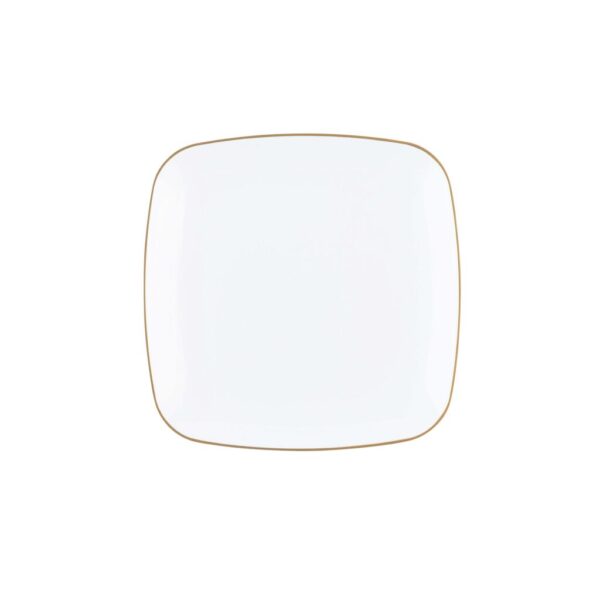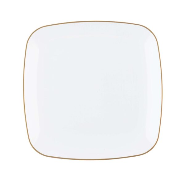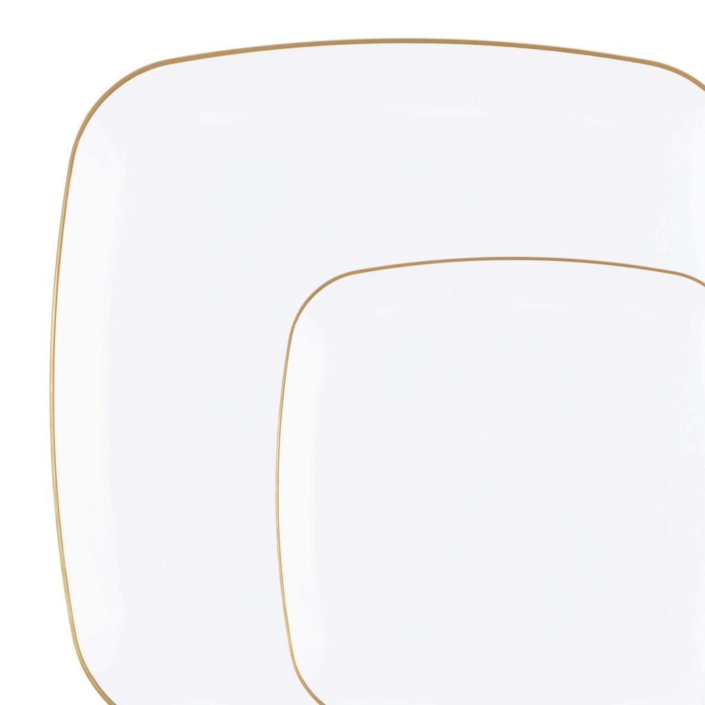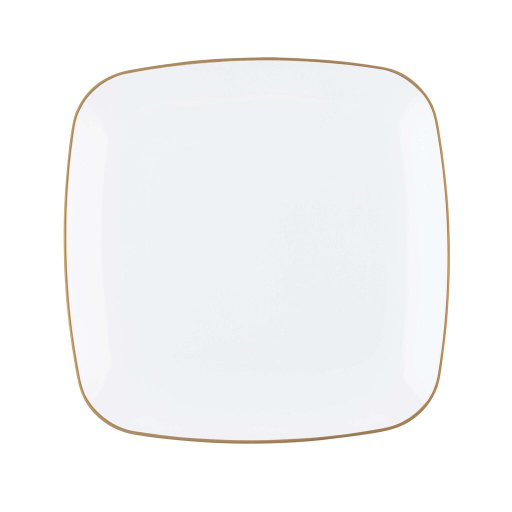 A timeless square design with white gold-rim on quality plastic plates. The plates are the perfect addition to any party! Your guests will not believe these china looking plates are disposable!