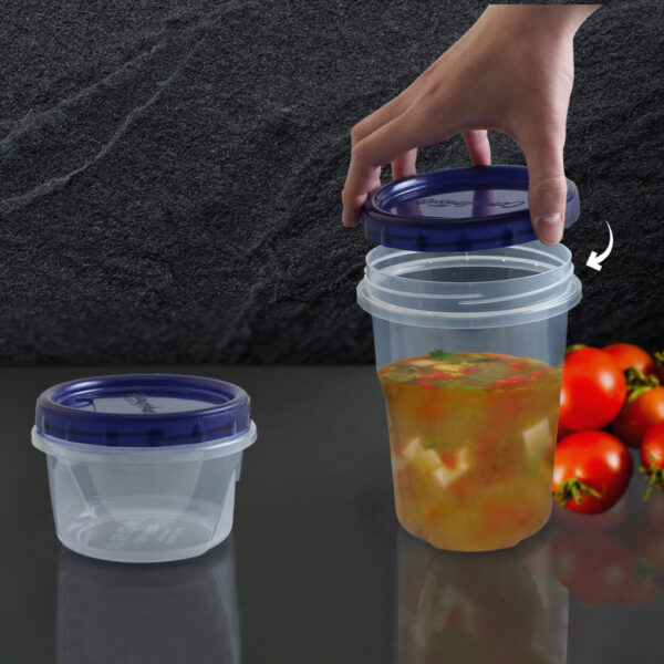 Fill this container with salad, soup or pasta and twist the lid shut. These are the perfect containers for lunch on-the-go or to store leftover food in the fridge or freezer. The containers are strong and durable and can be reused many times.
